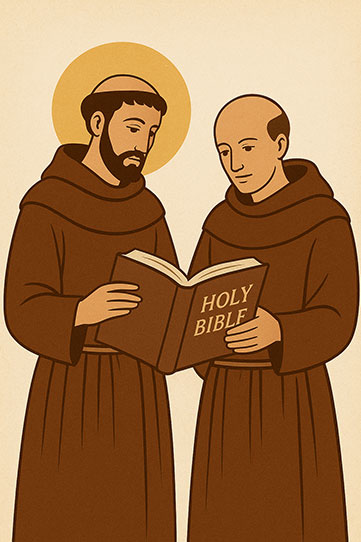 He was soon joined by his first companion, Bernardo di Quintavalle, a wealthy and prominent townsman who was deeply moved by Francis's radical witness. Seeking divine confirmation for this new way of life, the two men went to the Church of Saint Nicholas, where they prayed and asked for guidance. They opened the Bible three times, and in a moment that would define the Franciscan charism, their eyes fell upon three texts in sequence: